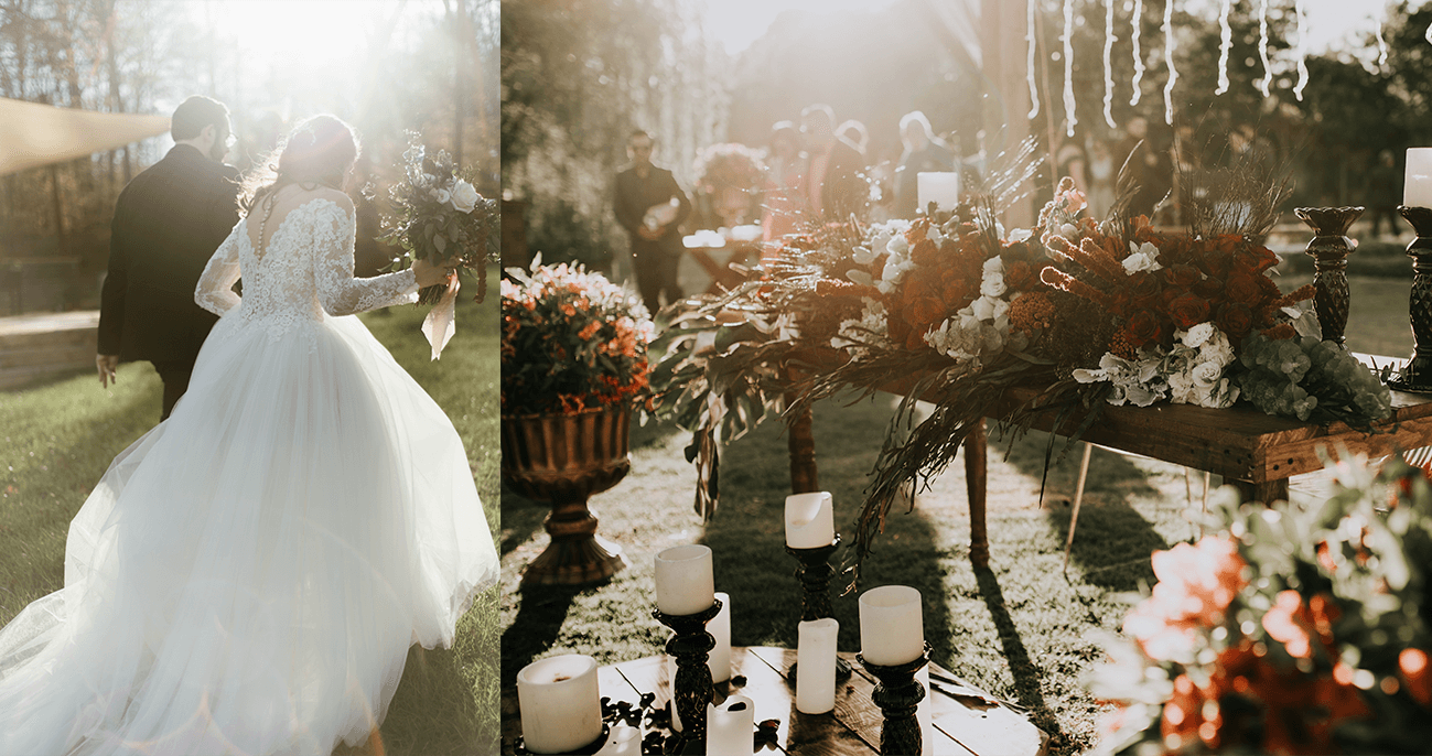 Outro ponto importante a se considerar é o estilo e o local da festa e da cerimônia. Se o seu orçamento permitir, tenha um vestido para a cerimônia e outro para a festa, geralmente mais confortável. O vestido precisa conversar com a decoração e com o ambiente da festa. Por exemplo, para um casamento no campo, o mais recomendado são vestidos delicados, com rendas, tules e babados. Tecidos leves e com ares de boho dão este toque delicado de final de tarde.